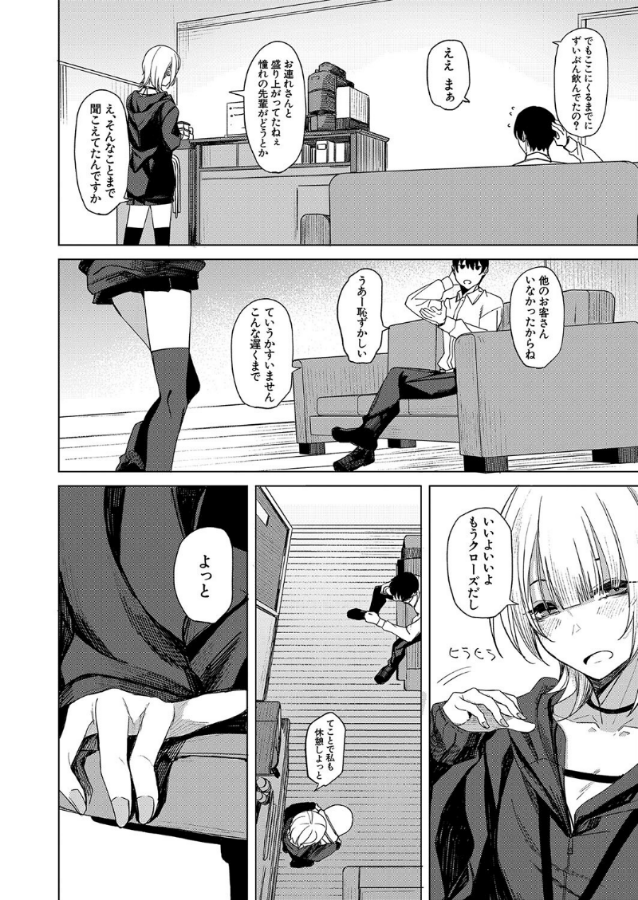 閉店後のシーシャ屋に残された青年と、その店のバイトの女子店員。介抱してくれた店員に憧れの先輩の話で盛り上がっていたことを話す青年だったが、彼女の胸を見ていたことをきっかけに、誰もいない店の中で次第にエロい雰囲気になっていく。実は童貞だった青年は、彼女に気取られないようにするが、淫靡な彼女には抗いきれず……!
