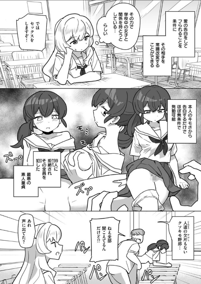 「常識改変してない女子、怖い…」告白して振られたら(振ってきた相手を)常識改変できる能力を用いて《性処理ペット》を量産している鬼畜外道クソキモ野郎の大路(おおじ)くん。そしてその相棒もとい棒を入れる穴としても併用されているツッコミ役の本鞠(もとまり)さん。学内の女生徒にコクっては振られ、振られてはハメる……そんな最高の学生生活に、大きな異変が。大路にガチ恋していた、ヤバいメンヘラ娘(カワイイ)がいたらしく……。