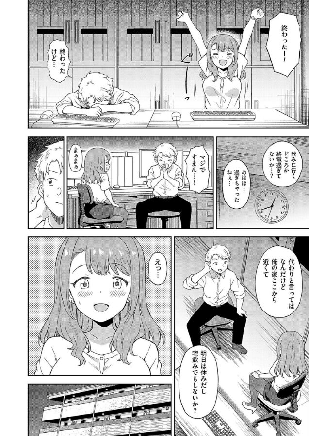 片想い中の同期OL・春日野に飲みに行こうと誘われるも、業務がまだまだ残っていた主人公・本橋。春日野は二人でチャチャっと終わらせようと言ってくれたが、終わった頃には終電もなくなっていて…。代わりに本橋の家で宅飲みをすることになるも、春日野は早々に酔い潰れてしまう。隙だらけになっている春日野への煩悩を断つべく、風呂場で性欲を自己処理していると、そこに裸の春日野がやってきてーー!?イチャラブの俊才・デコスケ先生が可愛さ満点★えちえちOLでデビュー♪